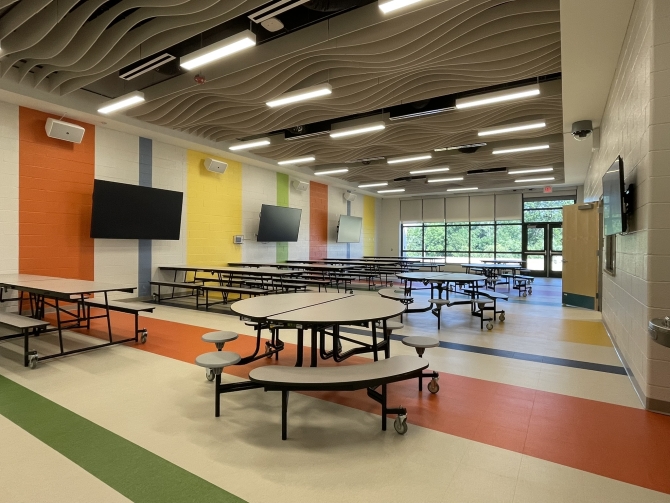 Inside, the middle school features bright and colorful spaces that spark creativity and collaboration in its 21 brand-new classrooms. “The middle school was designed with natural light in mind, with the use of curtain walls in the Media Center. The classrooms have great views of the countryside, and different colored corridors were used for wayfinding,” mentioned Project Manager and Architect, Carrie Zegarski. The cafeteria and music rooms include sound baffles to create a comfortable atmosphere with controlled acoustics.